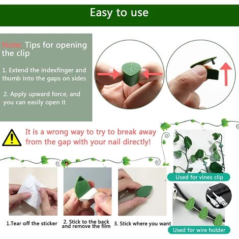 Contenu de l’emballage : 40 pinces murales pour plantes et 48 autocollants adhésifs en acrylique transparent. La couleur verte et la forme des feuilles peuvent rendre les pinces pour plantes grimpantes cachées dans les plantes vertes et difficiles à trouver. MATÉRIAU DURABLE : les pinces murales pour plantes grimpantes. est fabriqué en ABS de bonne qualité durable, d’environ 1,10 cm de long ; l’autocollant adhésif acrylique amélioré peut être fermement collé sur le mur, n’endommagera pas le mur. FACILE À UTILISER: Les clips de fixation de plantes pour vignes sont faciles à utiliser. Il suffit d’étendre l’index et le pouce dans les espaces des deux côtés des clips , et appliquez une légère force vers le haut, et vous pouvez facilement l’ouvrir puis l’utiliser.BEAUTIFY: les vignes vertes poussent à volonté, affecteront la beauté de la maison, avec ces clips de montage mural d’escalade pour plantes peuvent laisser les vignes pousser dans la direction que vous voulez, ce qui rend votre maison ou plus belle. Polyvalent : le mur de support de vigne peut non seulement être appliqué pour la décoration à l’intérieur ou dans la cour, mais peut également être utilisé comme support de fil pour rendre la maison plus propre.