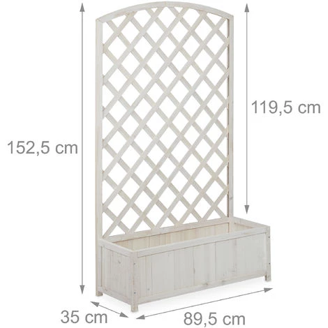 Embellissez votre jardin avec ce treillis en bois de sapin décoratif. La jardinière pratique avec treillis donne aux plantes grimpantes de toutes sortes un bon maintien. Créez votre propre mur fleuri que ce soit comme décoration de jardin, cache-vue ou mur de séparation. Idéal pour une entrée de maison, un balcon ou une terrasse pour attirer le regard. Le fond de la jardinière dispose d’un caillebotis amovible. Disposez un ou plusieurs pots de fleurs ou tout simplement une toile de paillage au fond de la jardinière.