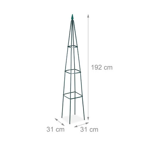 Cette arcade à rosiers pyramide en métal revêtu par poudre ne fournit pas seulement aux plantes grimpantes la prise nécessaire à son développement, elle aussi très belle par elle même. La forme pyramidale est très décorative dans votre jardin. Les plantes grimpantes et les plantes utiles, les rosiers, baies et fruits rouges ainsi que les tomates grandissent sur l’espalier en métal. L’obélisque a en plus une pointe avec ornements très décoratifs.. Pour une meilleure stabilité de l’obélisque, plantes les barres à quelques centimètres de profondeur dans la pelouse ou la jardinière.